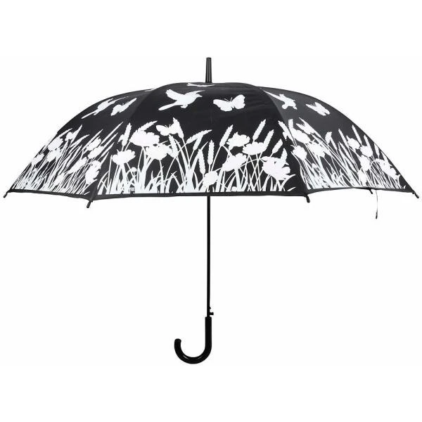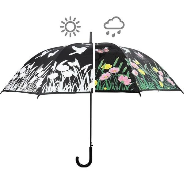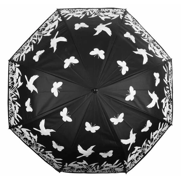 Met deze paraplu kan je alleen maar hopen dat het snel gaat regenen. Eens de paraplu nat wordt, verandert de witte print in een kleurrijke bloemenweide waar de vlinders en vogels vrolijk in rond fladderen.